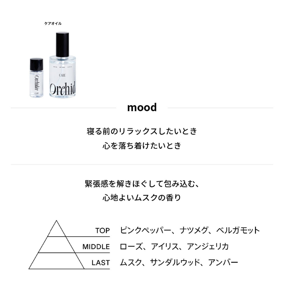 入り口は、ややスパイシーでクセのない甘さのピンクペッパーやナツメグ。爽やかで品のあるベルガモットやアイリスがふわりと柔らかに立ち昇り、ラストノートはそっと顔を覗かせたムスクやアンバーが優しく包み込む。リラックス感のある香りでゆっくりと深呼吸をして、自身を労ることも忘れずに。